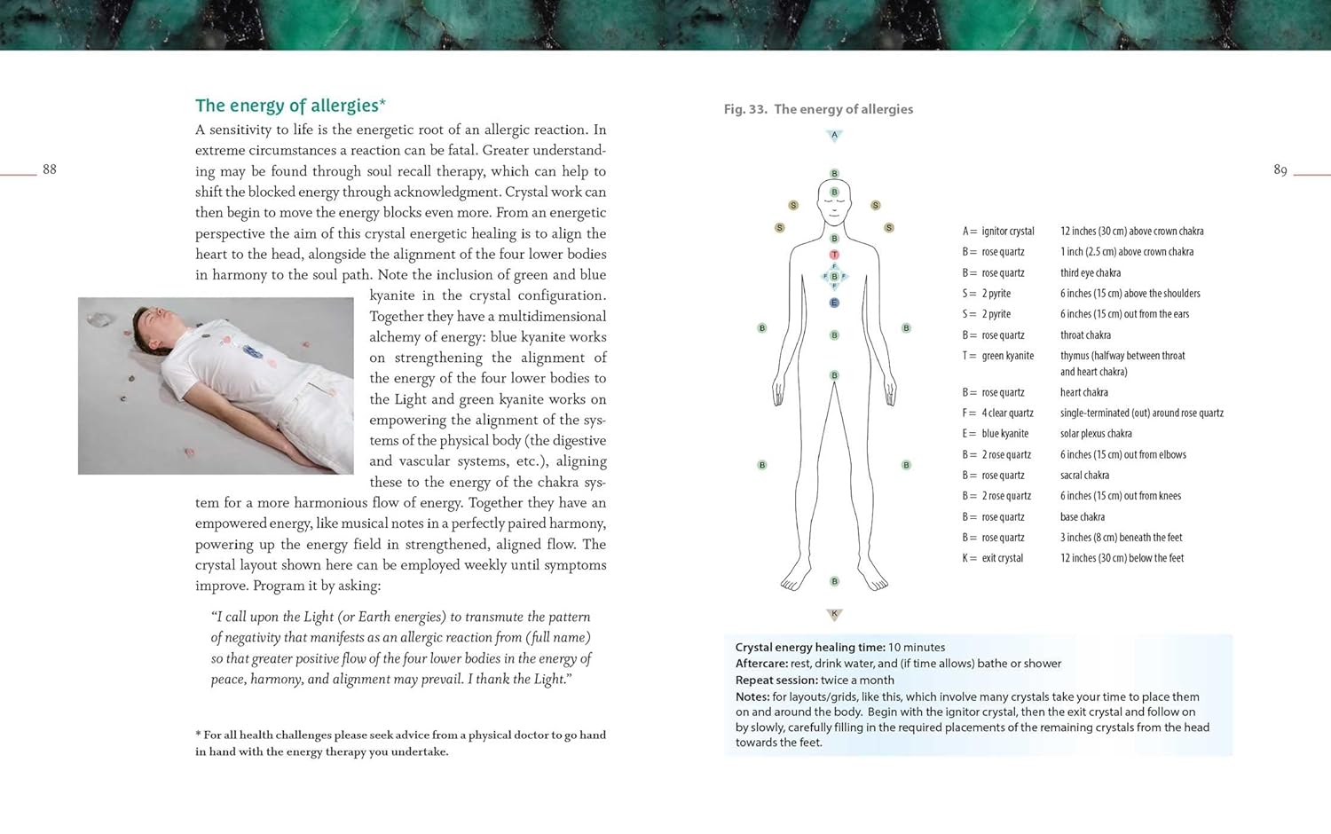 The author presents crystal body layouts for general energetic enhancement as well as for conditions and diseases for the skeletal structure, the heart and vascular system, the digestive system, the immune system, skin and hair, and the head. She explores the metaphysical origins of each ailment, which crystals to use, how to program them for targeted energy channelling, and how to arrange them on the body. In addition to physical ailments, the author also includes four gemstone body grids to attract peace, vitality, wisdom, and abundance.